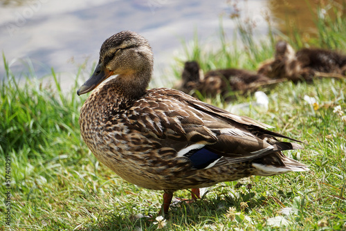 © PX Media, Obraz premium Mallard duck on grass, water in background