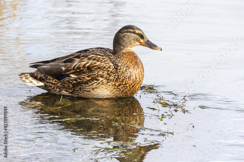 Fototapeta premium Mallard duck on the river water on a sunny day with reflections in the water