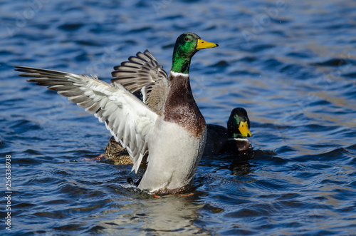 Fototapeta premium Mallard Duck Stretching Its Wings While Resting on the Water