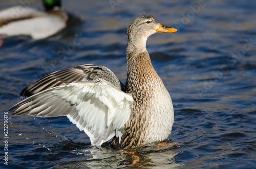 Fototapeta premium Mallard Duck Stretching Its Wings While Resting on the Water
