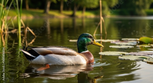 Fototapeta premium Mallard duck swims gracefully on a serene pond amidst lily pads and reeds