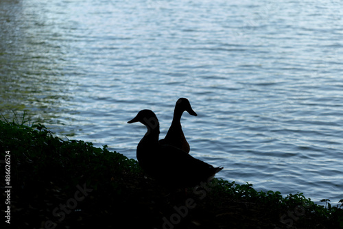 Fototapeta premium Mallard ducks by pond edge. Male with distinctive green head and white neck ring, female with mottled brown feathers. Waterfowl in natural habitat.