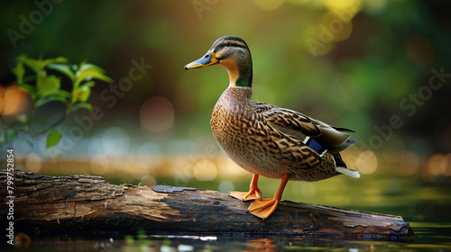 Fototapeta premium Mallard on Log, A mallard duck stands majestically on a log over tranquil...