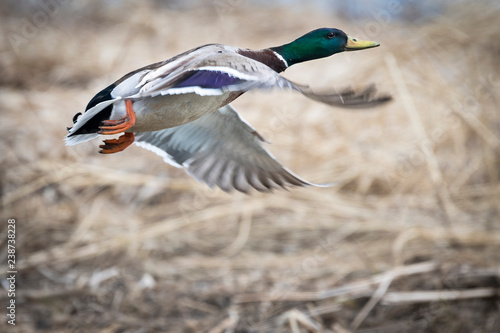 Obraz premium Mallard taking flight from a marsh in the St. Lawrence River