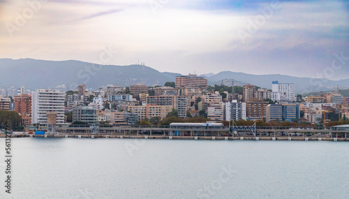 © Irina, Naklejka premium Mallorca, Spain - October 22, 2022, Port Alcudia in the early evening, view of the city from the sea in Mallorca