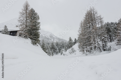 © bill_17, Fototapeta premium Maloja, Dorf, Engadin, Oberengadin, Winter, Wintersport, Winterwanderweg, Langlauf, Langlaufloipe, Alpen, Graubünden, Schweiz