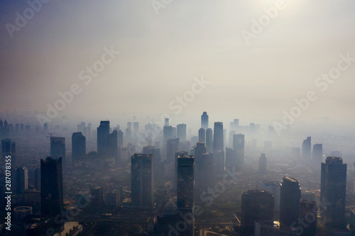 © Creativa Images, Fototapeta premium Malownicze zanieczyszczenie powietrza sylwetka drapaczy chmur