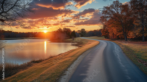 © Sawyer0, Fototapeta premium Malowniczy widok jeziora otoczonego delikatnym światłem zachodzącego słońca.