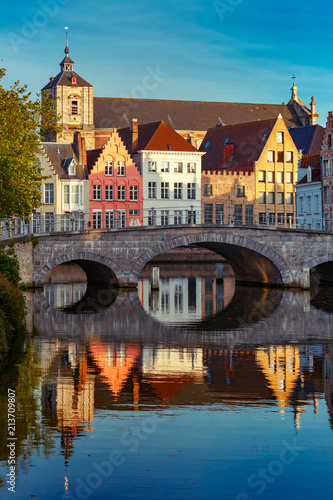 Fototapeta premium Malowniczy widok na kanał Brugii z pięknymi średniowiecznymi kolorowymi domami, mostem i odbiciami wieczorem złotej godziny, Belgia