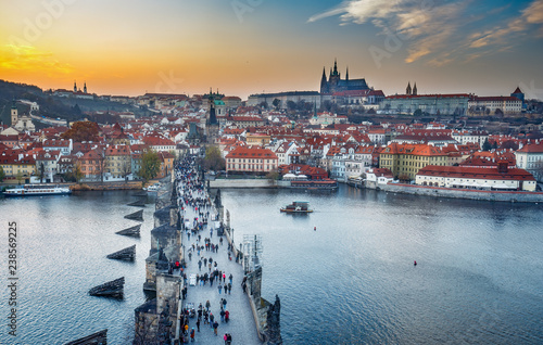 Naklejka premium Malowniczy widok z lotu ptaka na Most Karola i Zamek na Hradczanach w Pradze, Republika Czeska, o zachodzie słońca. Tło podróży.