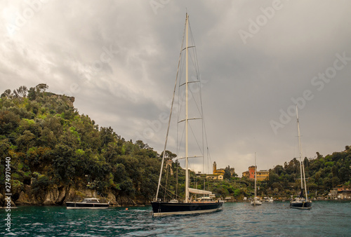© Simona Sirio, Obraz premium Malowniczy widok z morza na zatokę Portofino, słynną wioskę rybacką na Riwierze Liguryjskiej, z luksusowymi żaglówkami i jachtami zakotwiczonymi w małym porcie w pochmurny dzień, Genua, Liguria, Włochy