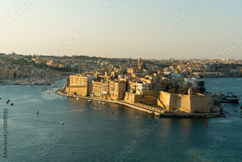 Fototapeta premium Malta, Valletta, August 2019. View of an old fortress in a large harbor.