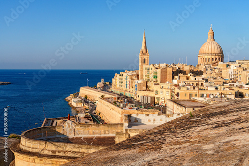 Obraz premium Malta Valletta Skyline with Basilica of our Lady of Mount Carmel Dome and St.Pauls Anglican Cathedral Spire, Valletta, Malta,Europe