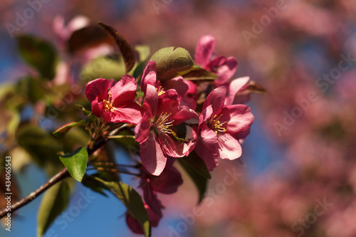 © Mariana Rusanovschi, Obraz premium Malus halliana blossoming red fruit tree an apple-tree against background of blue sky