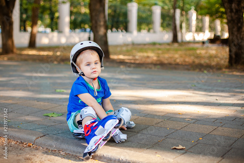 © Lena May, Obraz premium Mały blond chłopiec 3 lata w białym sportowym kasku i niebieskiej koszulce na rolkach w letnim zielonym parku. Specjalne problemy z oczami dziecka. Krótkowzroczność, astygmatyzm, zezowate oczy