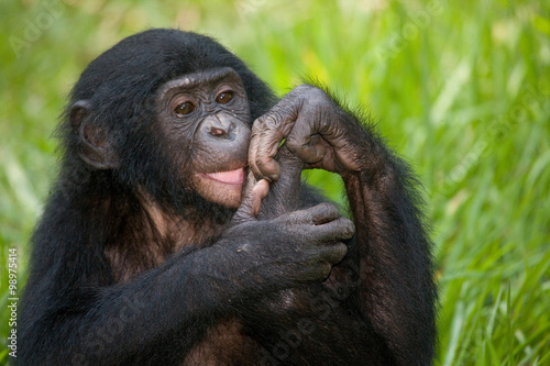 Naklejka premium Mały bonobo coś je… Demokratyczna Republika Konga. Park Narodowy Lola Ya BONOBO. Doskonała ilustracja.