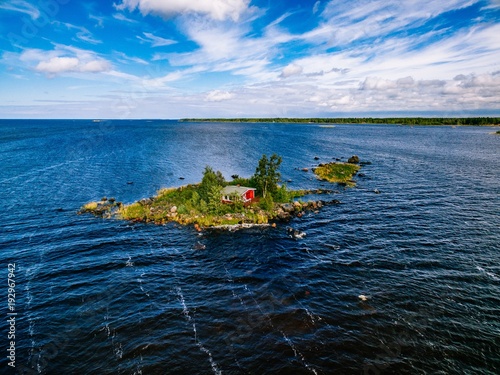© nblxer, Naklejka premium Mały czerwony domek na wyspie na błękitnym morzu w letni dzień. Finlandia. Widok z góry.