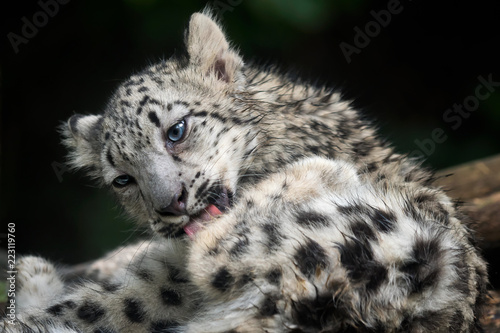Fototapeta premium Mały lampart śnieżny (Panthera uncia). Młody lampart śnieżny oblizuje swoje...