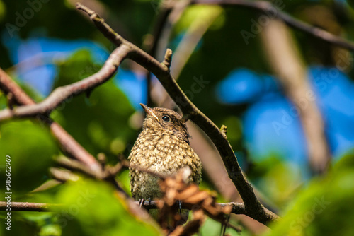 © arekzet62, Fototapeta premium Mały ptak (drozd) ukryty wśród liści.