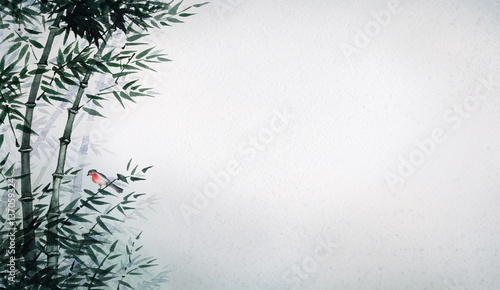 © Marina, Obraz premium Mały ptaszek w bambusowym gaju. Obraz w stylu japońskim