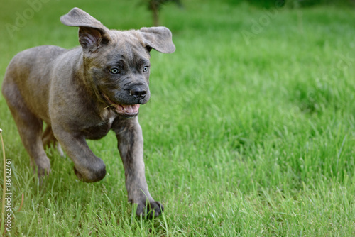 Obraz premium Mały szczeniak cane corso biegnie po trawie