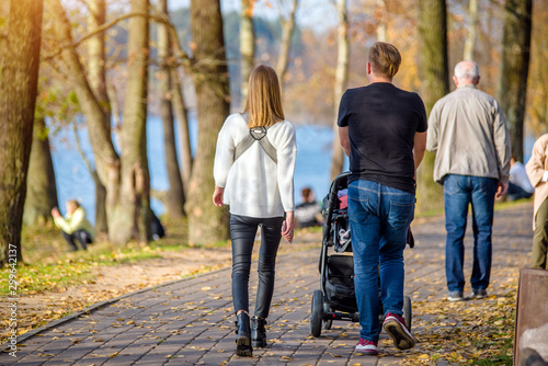 Fototapeta premium Małżeństwo toczy wózek dziecięcy w miejskim parku