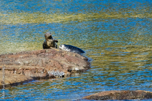 © Dennis Laughlin, Fototapeta premium Mama and baby harbor seal on a rock