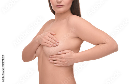 Fototapeta premium Mammology. Naked woman doing breast self-examination on white background, closeup