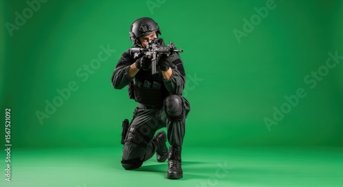 © Dmitry, Naklejka premium Man, a special forces soldier, aims with a rifle while kneeling against green background. Chroma key screen for military concept.