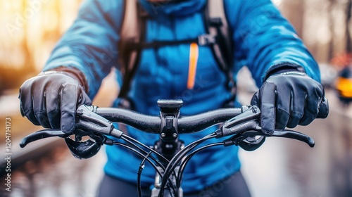 © Khatyjay, Obraz premium Man Adjusting Helmet Straps While Holding Bicycle Handlebars in Bright Lighting, Captured with Soft Focus for a Portrait of Outdoor Activity Enthusiasm