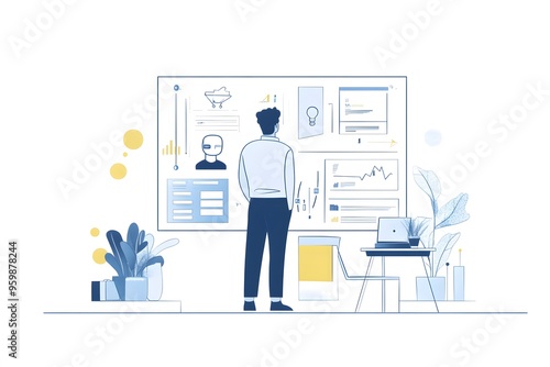 © irawan, Obraz premium Man Analyzing Business Data on a Whiteboard with Graphs and Charts