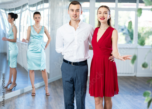 Naklejka premium Man and girl take dance lessons from experienced teacher. Couple in stage...
