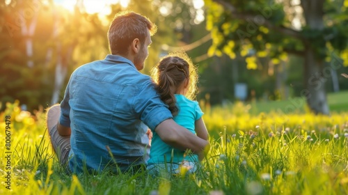 © Prostock-studio, Fototapeta premium Man and Little Girl Sitting in Grass