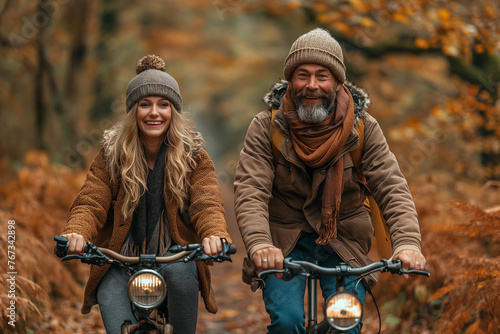 Fototapeta premium Man and Woman Biking in the Woods