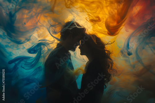 © lucky pics, Fototapeta premium Man and woman embracing in surreal, colorful liquid fantasy dreamscape. Neural network generated image. Not based on any actual person or scene.
