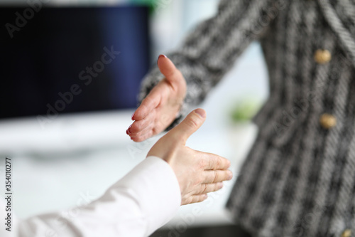 Fototapeta premium Man and woman extend their hands in greeting