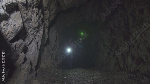 © Evgenii Petrushin, Obraz premium man and woman go with lanterns in the cave