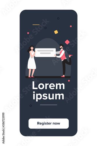 © PCH.Vector, Naklejka premium Man and woman holding banner with text. Speech bubble, announcement, info flat vector illustration. Communication and advertising concept for banner, website design or landing web page
