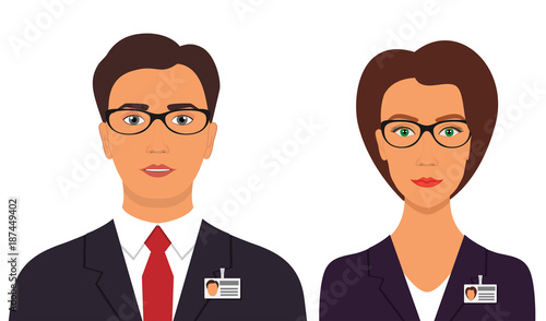 Naklejka premium Man and woman in business suits with badges and glasses. Business avatar...