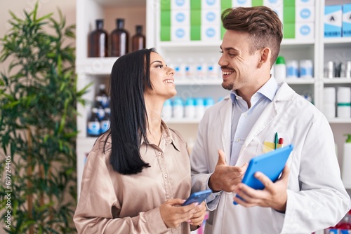Fototapeta premium Man and woman pharmacist and client using smartphone and touchpad at pharmacy