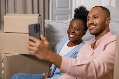 Fototapeta premium Man and woman taking selfie with smartphone in their new home after relocation