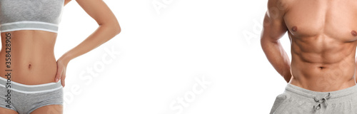 Fototapeta premium Man and woman with slim bodies on white background, closeup. Banner design