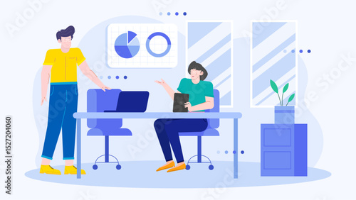 © Hiro, Obraz premium Man and woman working together in a modern office setting with computers. Suitable for business presentations and corporate websites.