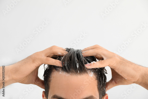 Naklejka premium Man applying shampoo onto his hair against light background, closeup. Space...