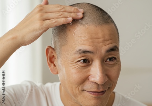 © IbragimovN, Obraz premium Man applying skincare to bald head for hydration and care