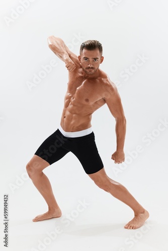 Obraz premium Man athletic body bodybuilder in briefs with naked torso abs full-length in...