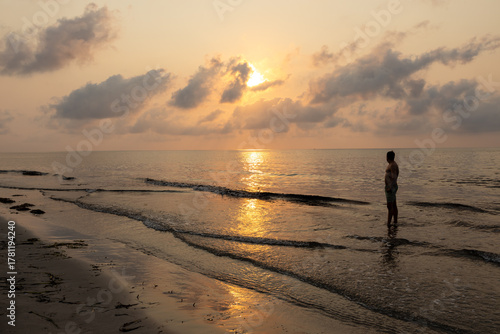 © OneLoveOnePhoto, Fototapeta premium Man bathing on the beach at dawn.