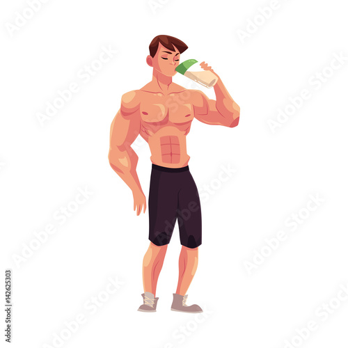 © sabelskaya, Fototapeta premium Man bodybuilder, weightlifter drinking protein shake after training, cartoon vector illustration isolated on white background. Full length portrait of man bodybuilder drinking protein shake