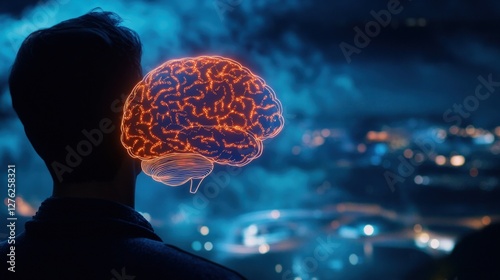 Fototapeta premium Man, Brain, Night City, Future, Thought, Innovation, Concept, Design