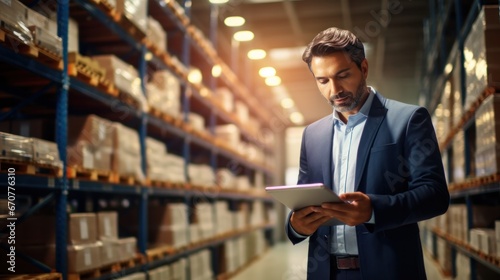 Fototapeta premium man business owner using checklist recheck amount of stock product inventory on shelf at distribution warehouse factory.logistic business ship and delivery, inventory flow, professional